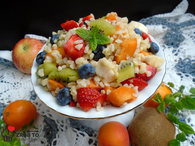 Sałatka owocowa to zdrowy pomysł na deser dla całej rodziny. Lekka, orzeźwiająca, pełna kolorów i przeróżnych smaków, idealna w upalne dni. Wzbogacona o kaszę bulgur staje się również pożywna. Idealna na drugie śniadanie w domu czy w pracy a także do zabrania ze sobą w pudełku na spacer czy piknik.