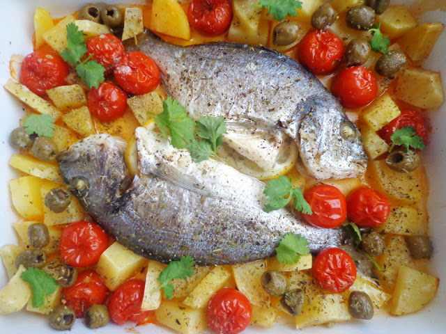 Zapraszam Was na danie, które samo się robi i nie wymaga długich przygotowań. Wystarczy do naczynia żaroodpornego wrzucić doradę, ziemniaki pokrojone w kostkę, pomidorki, oliwki i po ok. pół godzinie pieczenia mamy gotowy obiad. Nie ma chyba nic prostszego 😉 Smacznego ;):)