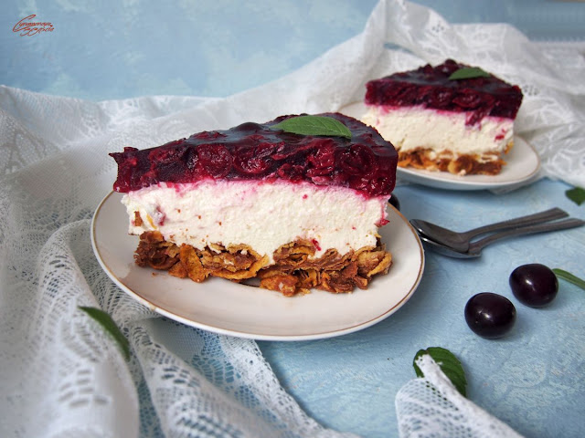 Sernik na zimno na kruchym czekoladowym spodzie oblany wiśniową frużeliną