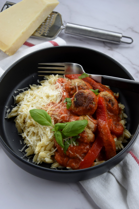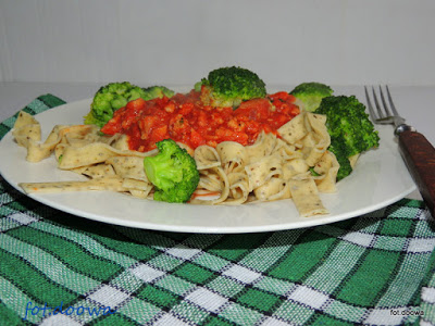 Makaron z oregano, sosem pomidorowym z łopatką wieprzową i boczniakami
