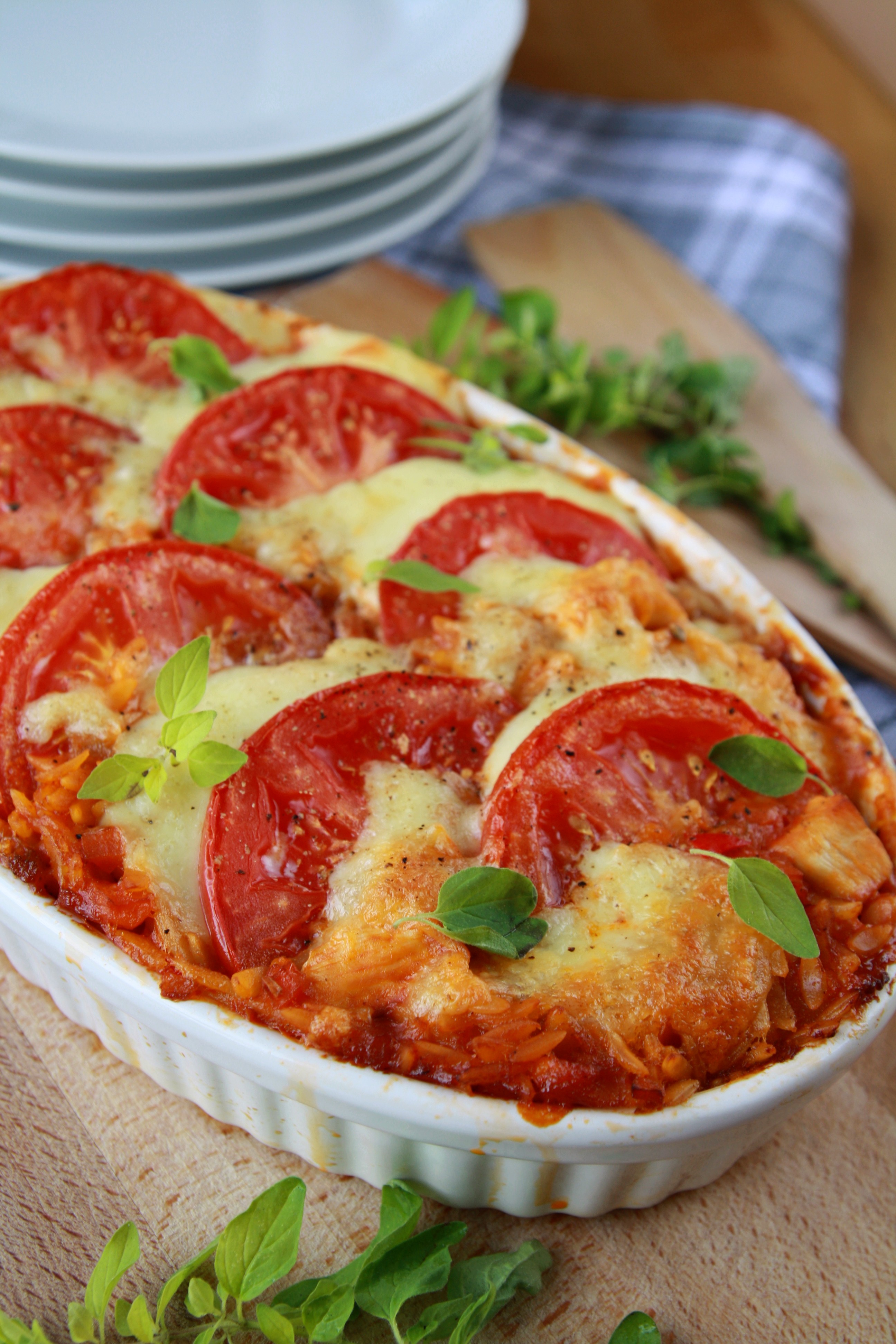 Po ciepłym przyjęciu przez moją rodzinę zielonej zapiekanki z orzo zostałam zachęcona do dalszych eksperymentów kulinarnych z użyciem drobnego makaronu. Jest on świetny w takich zapiekankach ponieważ szybko się gotuje i bardzo dobrze pochłania wszystkie pyszne smaki. W tej wersji postawiłam na pomidory, z delikatnym, soczystym kurczakiem. Na