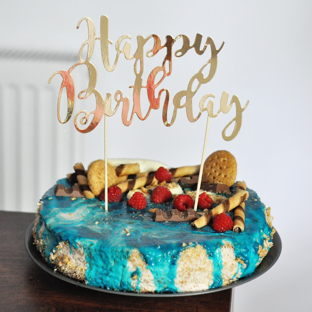 TORT (ciasto?) BANANOWY 🍌Spóźniony urodzinowy M. 💙 Nie jestem dobra w torty, ale lubię je robić. Miały być dwa piętra, ale mała forma została w Rzeszowie. Podstawa jest mega zdrowa , a dodatki to pokruszone ciacho, stopiona karmelowa czekolada z niebieską spiruliną , rurki, kinderki, maliny i ciacha