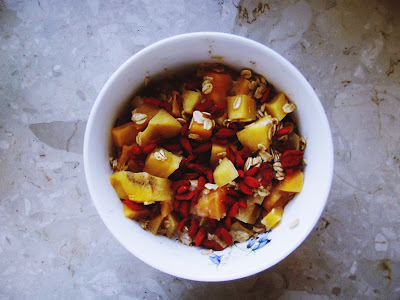 pieczona owsianka z mlekiem sojowym, miodem, kaki i jagodami goibaked oatmeal with…