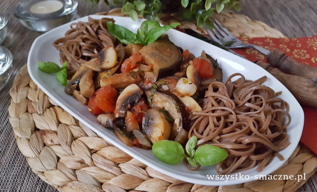 Danie doprawione aromatycznymi ziołami i podane z makaronem Soba przypadnie do gustu tym, którzy lubią bakłażany, a także pomidorowo-ziołowe smaki.