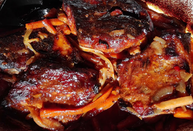 Pomysł na żeberka z „Doradcy smaku”,bardzo fajny obiad,żeberka pięknie rumiane,do tego pyszne warzywa,ugotowałam do tego jeszcze ryż i pyszny obiad gotowySkładniki:800 g żeberek100 ml białego wytrawnego wina3 łyżeczki Musztardy rosyjskiej Prymat3-4 łyżki miodu1 biała cebula2 marchewki1 seler naciowy1 pietruszka3 pomidory pelati z zalewą50 ml
