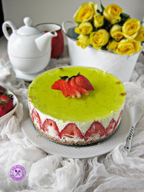 Sernik z serków wiejskich z chia, truskawkami i galaretką agrestową