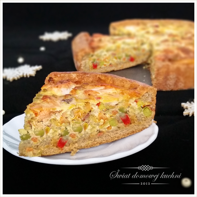 Na farsz:300 g łososia,garść suszonych pomidorów,½ dużego jabłka,1 średnia marchewka,100 g groszku…