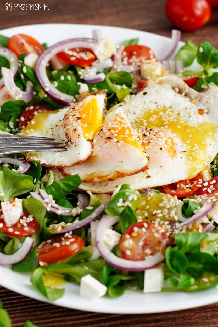 Sałatka z jajkiem sadzonym, roszponką, pomidorkami i serem sałatkowym. Prosty, szybki i…