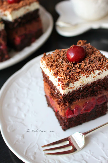 Czarny Las jedno z bardziej popularnych i lubianych przez nas ciast. Przepyszne, wilgotne, mocno czekoladowe ciasto z delikatnym kremem z ubitej śmietany, dodatkiem konfitury wiśniowej, a wszystko polane aromatyczną czekoladą – jedno z pyszniejszych połączeń smakowych