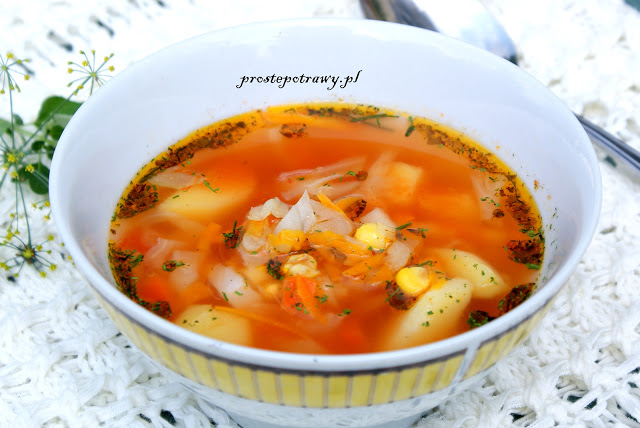 2 marchewki1 pietruszka5 średnich ziemniaków1 cebulakawałek pora i seleramała puszka kukurydzymała główka kapustyok. 5 łyżek włoskiej passaty z bazylią, kto lubi bardziej wyrazisty smak pomidorów doda jej więcejsól, pieprzolej do smażeniamajeranek, zioła prowansalskie, liść laurowy, kilka ziaren pieprzu, pieprz ziołowyświeży lubczyk, koperewentualnie kawałek kostki bulionowej