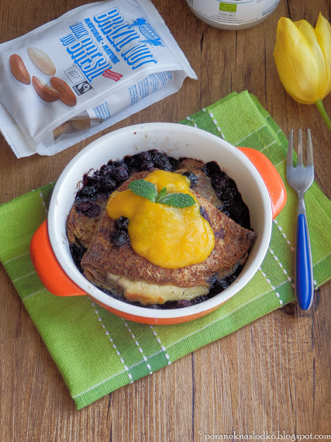 Naleśniki z mąki słonecznikowej nadziane orzechowo-morelową* ricottą i zapieczone z borówkami polanymi…