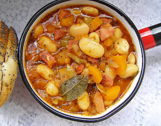 fasola Jaś 50 dag, ziele angielskie 4 sztuki, liście laurowe 2 sztuki, soda oczyszczona 1 szczypta, kostka rosołowa 1 sztuka, marchew średnia 5 sztuk, woda 1,5