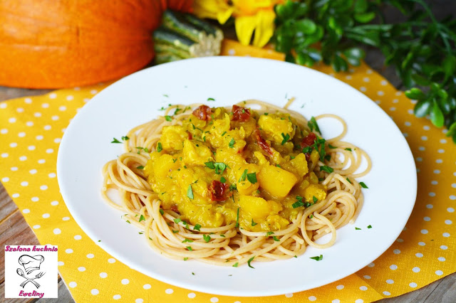 Rozgrzewające spaghetti z kawałkami kurczaka, aromatycznym sosem z dyni pachnącym cebulką, aromatycznym czosnkiem i wyrazistymi suszonymi pomidorami to świetny pomysł na szybkie w przygotowaniu i pełnowartościowe danie.