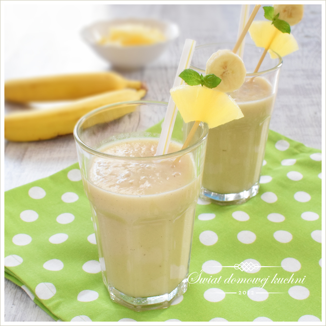 500 ml mleka kokosowego,2 szklanki pokrojonego ananasa,1 łyżeczka ekstraktu waniliowego,2 banany.