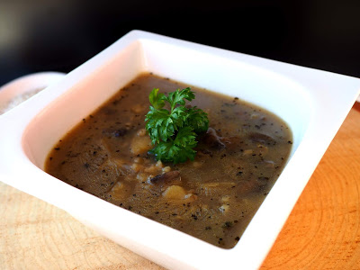 Prosta zupa pieczarkowa z ziemniakami i dodatkiem kaszy jęczmiennej.