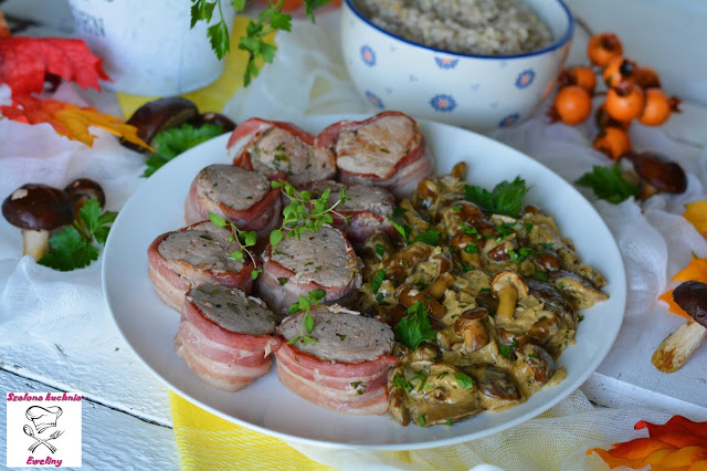 700g polędwiczek wieprzowych (2 sztuki)8-10 plastrów wędzonego boczku2 łyżki oleju Wielkopolskikilka gałązek świeżego tymiankusólpieprz