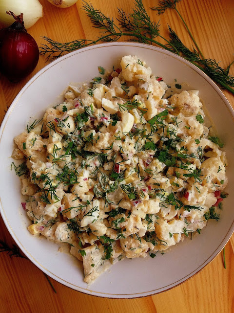 Dziś zapraszam na troszkę nietypową sałatkę kalafiorową, która jest wzorowana na klasycznej sałatce ziemniaczanej. Tak naprawdę różyczki kalafiora zastępują tutaj ziemniaki, co sprawia, że sałatka jest ciekawa propozycją dla osób ograniczających węglowodany. Przepis podpatrzyłam u Laury Vitale, ale zmodyfikowałam go do własnych potrzeb. Gotową sałatkę przechowujemy w szczelnie
