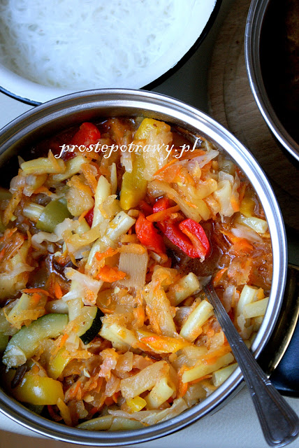 2 marchwieśrednia cukinia2 cebule2 garście fasolki szparagowejpo jednej papryce czerwonej, żółtej i zielonej1/4 główki małej białej kapustyolej do smażeniasłoik sosu chińskiegosól, pieprz mielony, odrobina cukru do smakuewentualnie łyżka lub dwie koncentratu pomidorowegododatkowo:30 dag mielonego mięsa1 cebula1 jajkook. 2 łyżek kaszy mannysól, pieprz