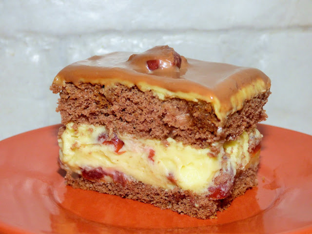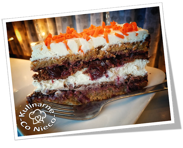 Miękki kakaowy biszkopt z masą budyniową, pijanymi wiśniami z czekoladowym ganache. Składniki…