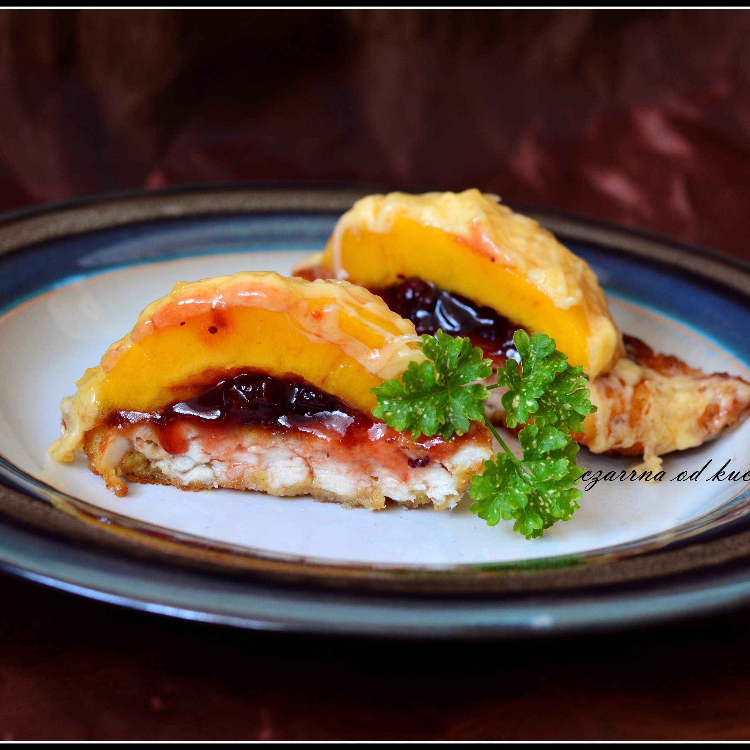 Składniki: 1 filet z kurczaka brzoskwinie z puszki 100 g sera żółtego…