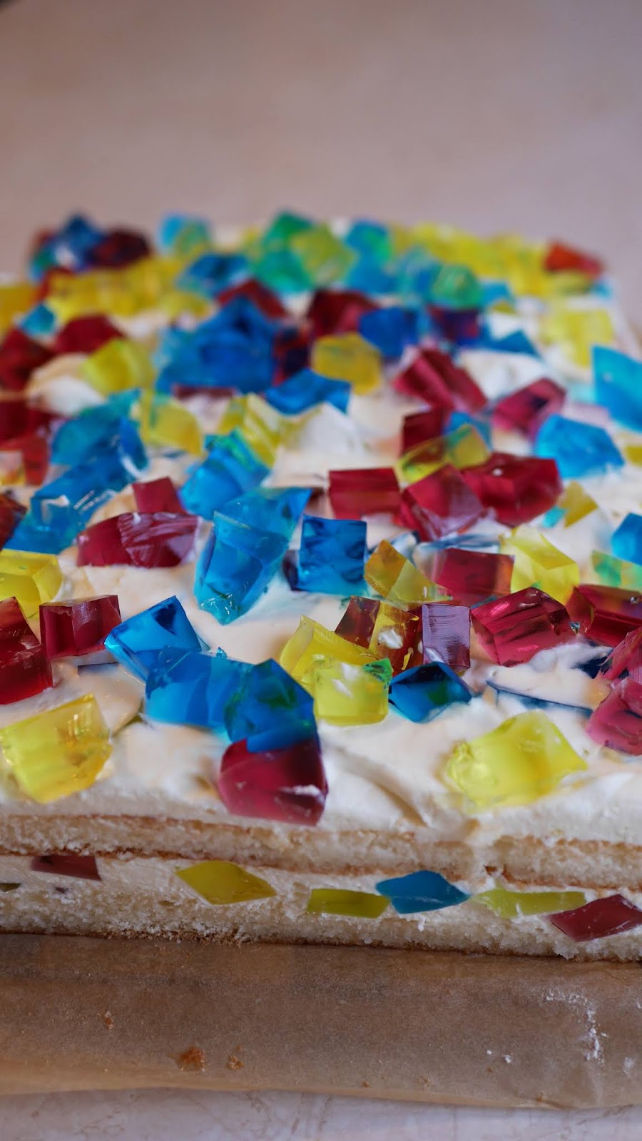 Kolorowe, przyciągające wzrok ciasto. Biszkopt nasyconą arakowym ponczem z puszystą śmietanką i uwielbianą przez dzieci galaretką. To propozycja na szybkie i bardzo proste ciasto.