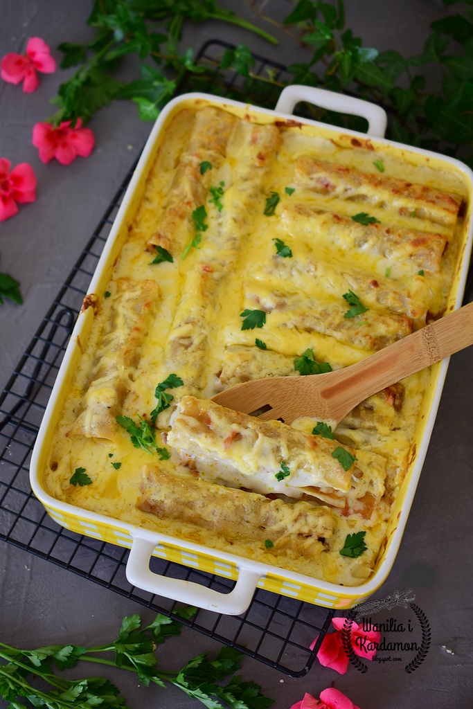 Pyszne i pożywne makaronowe danie z mięsem: grube cannelloni nadziewane farszem bolognese zapieczone w sosie beszamelowym z chrupiącą skorupką z sera żółtego, to jedno z dań które często się pojawia w mojej kuchni w sezonie jesienno zimowym, choć pracochłonne to warte przygotowania na smaczny obiad. Doskonale smakuje także