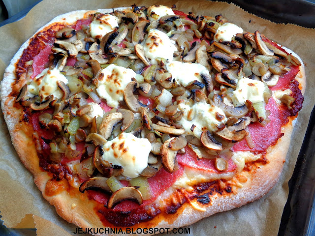 Składniki ciasta: 13 g świeżych drożdży,około 1,5 szklanki mąki,1/2 szklanki ciepłej wody,1/4 łyżeczki soli,1/2 łyżeczki cukru,łyżka oleju.Składniki farszu:około 100 g salami,500 g pieczarek,2 większe cebule,150 g tartej mozzarelli,100 g mascarpone.Składniki sosu pomidorowego:4