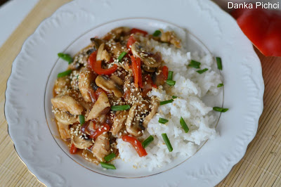 1 filet z piersi kurczaka (około 400 g)1 czerwona papryka1 średniej wielkości czerwona cebula200 g pieczarek2 łyżki sezamu2 łyżki oleju do smażeniaSos:
