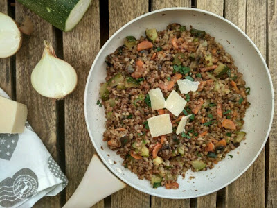 – pół woreczka kaszy gryczanej (ok. 50 g),- pół mniejszej cukinii (ok. 112 g),