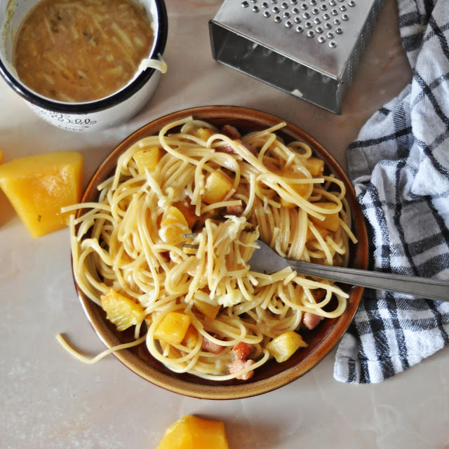 Spaghetti z dynową carbonarą 🎃🥓 Ja jadłam z dynią, M. ją wygrzebał i zostawił na talerzu 😂 ale mu smakowała! Jeżeli nie dodacie dyni będzie to klasyczny przepis na carbonarę, tak po prostu 🤤 Prawdziwa carbonara nie zawiera śmietanki! Pamiętajcie o tym 🙌