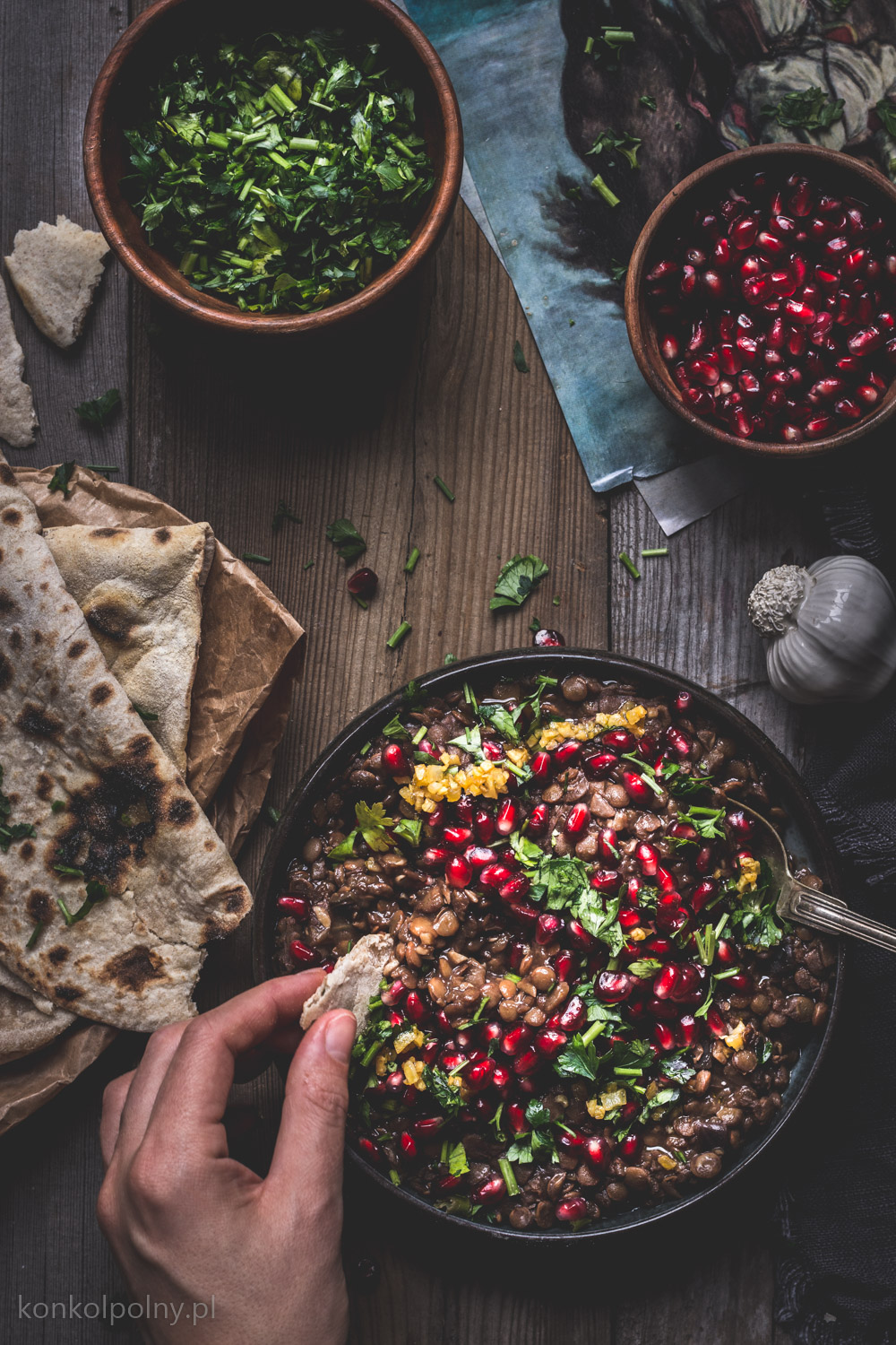Gulasz z soczewicą i granatem, który dziś Wam prezentuję, pochodzi z Palestyny. Tak naprawdę powinnam zatytułować ten post – gulasz z soczewicą i granatem oraz czosnkiem, bo czosnku w nim niemało Ale spokojnie, czosnek jest smażony i w ten sposób traci swoją intensywność, a staje się słodki. Rummaniyeh (oznacza granat)