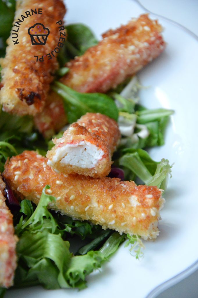 Surimi w panierce, czyli paluszki krabowe w chrupiącej panierce Panko, którą można kupić w dziale z orientalną żywnością. Jeśli jednak nie macie do niej dostępu, to spokojnie możecie użyć zwykłej bułki tartej, która będzie nieco mniej chrupiąca, ale przekąska wyjdzie równie pyszna 🙂