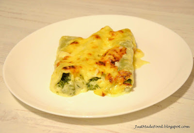 Cannelloni ze szpinakiem i serem gorgonzola, w sosie beszamelowym. Ser jest naprawdę świetnym dodatkiem do szpinaku. Co więcej, nie trzeba być fanem gorgonzoli, aby to danie smakowało, gdyż on nie dominuje. Fani tego sera mogą go dodać nieco więcej 😉