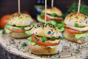 Szukasz świetnej przekąski imprezowej na Sylwestra, Andrzejki czy parapetówkę? Przychodzę Ci z pomocą! Imprezowe hamburgerki z serem Halloumi są genialną propozycją dla gości. Składają się z puszystych, mięciutkich bułeczek ziołowo-oliwkowych z posypaną czarnuszką na wierzchu. Do ich środka użyłam grillowanego sera Halloumi, sałaty lodowej, pomidora i lekkiego sosu czosnkowego. Powiem
