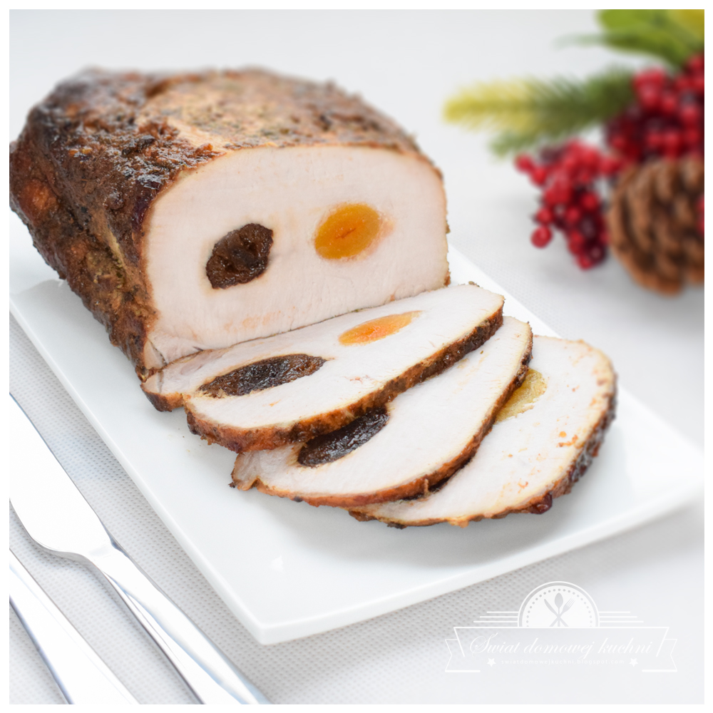 1½ kg schabu,około 10 suszonych śliwek,około 10 suszonych moreli,4 łyżki miodu,olej do obsmażenia.Marynata: