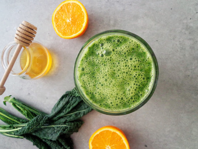Zielony koktajl z jarmużem, bananem i pomarańczą to znakomita propozycja dla miłośników owocowo-warzywnych połączeń w smoothie. Koktajl jest najprostszym sposobem na dostarczenie organizmowi niezbędnej ilości warzyw i owoców, zaspokajając na długo głód i natychmiast poprawiając nastrój. Polecam Wam serdecznie, zwłaszcza po świątecznych „grzeszkach” 😉