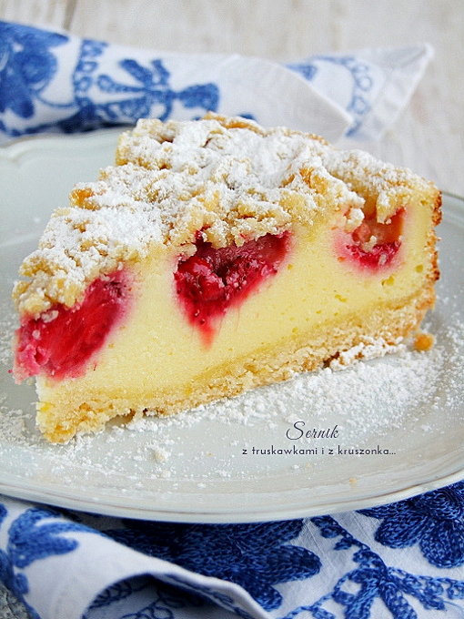 …sernik, truskawki i kruszonka; trzy smakowitości w jednym. W ramach opróżniania zamrażalnika upiekłam właśnie taki sernik z truskawkami i z kruszonką jest bardzo smaczny więc jak najbardziej polecam do zrobienia…