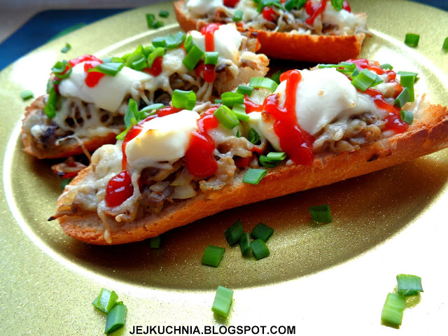 Składniki:2 długie bagietki,masło do posmarowania bagietek + 2 łyżki do podsmażenia pieczarek,2 większe cebule,80 dag pieczarek,mała papryka czerwona,30-35 dag sera żółtego,około 125 g serka mascarpone,2 garście posiekanego szczypiorku (najlepiej gruby),ketchup,sól,pieprz.Przygotowanie:Bagietki przekrawam wzdłuż na