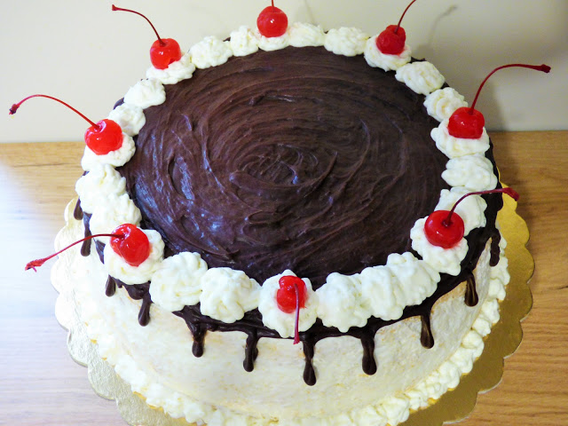 Jasny biszkopt, przełożony frużeliną wiśniową oraz kremem z bitej śmietany i białej czekolady z dużą ilością wiórek kokosowych. Wierzch obficie oblany czekoladowym ganache.