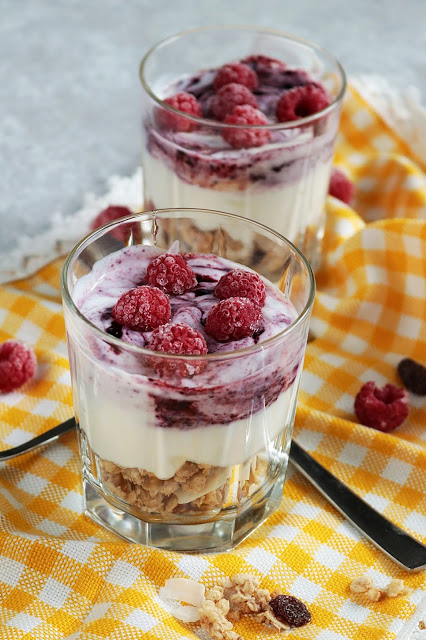 100 g musli300 gr jogurtu naturalnego2 łyżki miodu2 łyżeczki dżemu jagodowego domowej robotygarść malin lub innych owoców