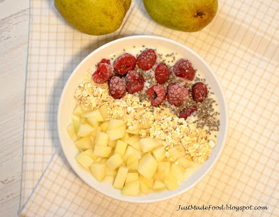 Składnikijogurt naturalny 140 g 50 ml mleka1 gruszka1 banando podania: gruszka, kilka malin, 2 łyżki płatków owsianych, 1 łyżeczka nasion chiaWszystkie składniki zmiksować. Przełożyć do miseczki