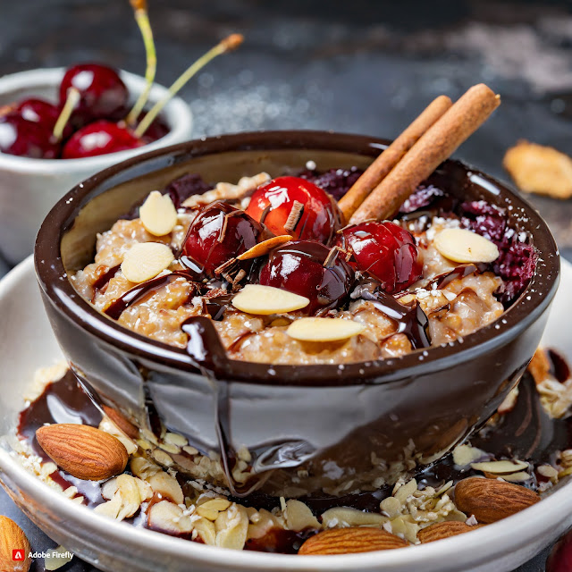 Owsianka korzenna z wiśniami w syropie, migdałami i czekoladą / Oatmeal with cherries in syrup, almonds and chocolate