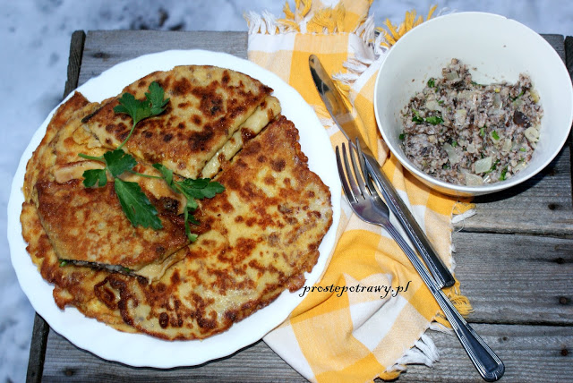 Składniki na farsz:szklanka ugotowanej kaszy gryczanej25 g grzybków mun2 średnie cebule, 3 ząbki czosnkusól, pieprz, cząberolej do smażenia