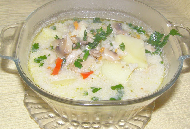 masło 1 łyżka, ziemniaki 4 sztuki, włoszczyzna 1/2 pęczka, pieczarki 50 dag, cebula 1 sztuka, pieprz ziołowy 1 łyżeczka, woda 2 litry, kostka rosołowa 1 sztuka, mleko 1/2 litra, mąka pszenna 4 łyżki, pieprz mielony 1 łyżeczka, sól – ile potrzeba, natka pietruszki 1 pęczek