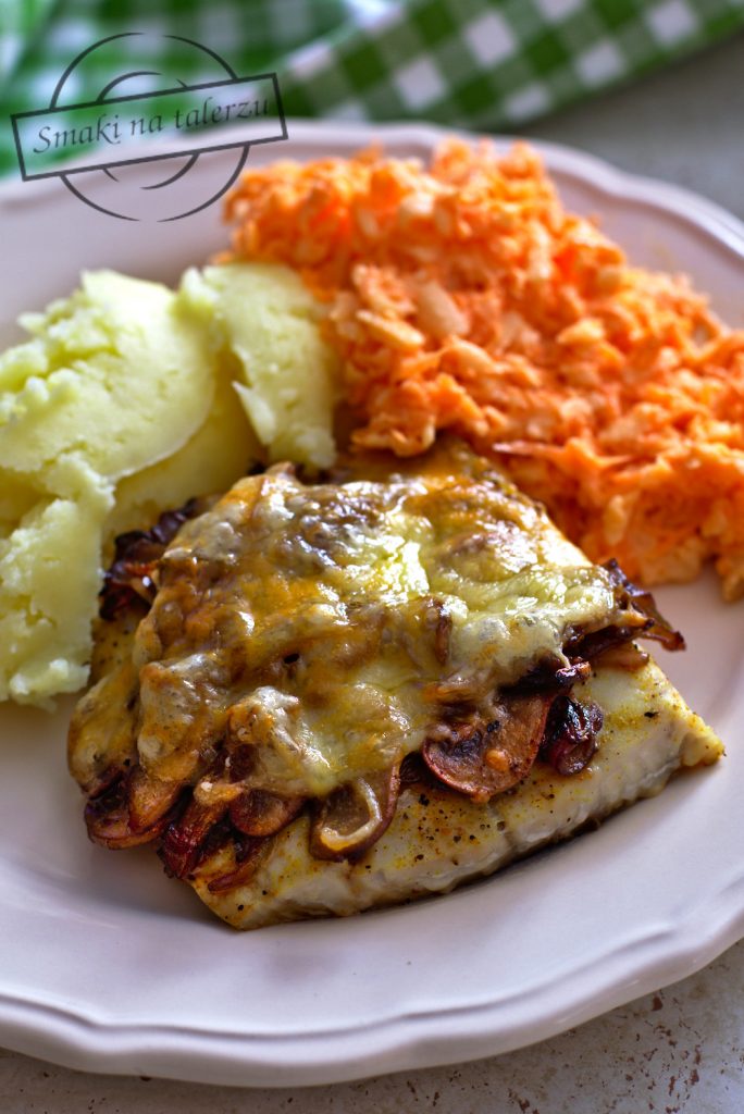 Pieczona ryba z dodatkiem podsmażonych z cebulką pieczarek oraz tartym serem, to fajny, prosty i szybki pomysł na obiad.
