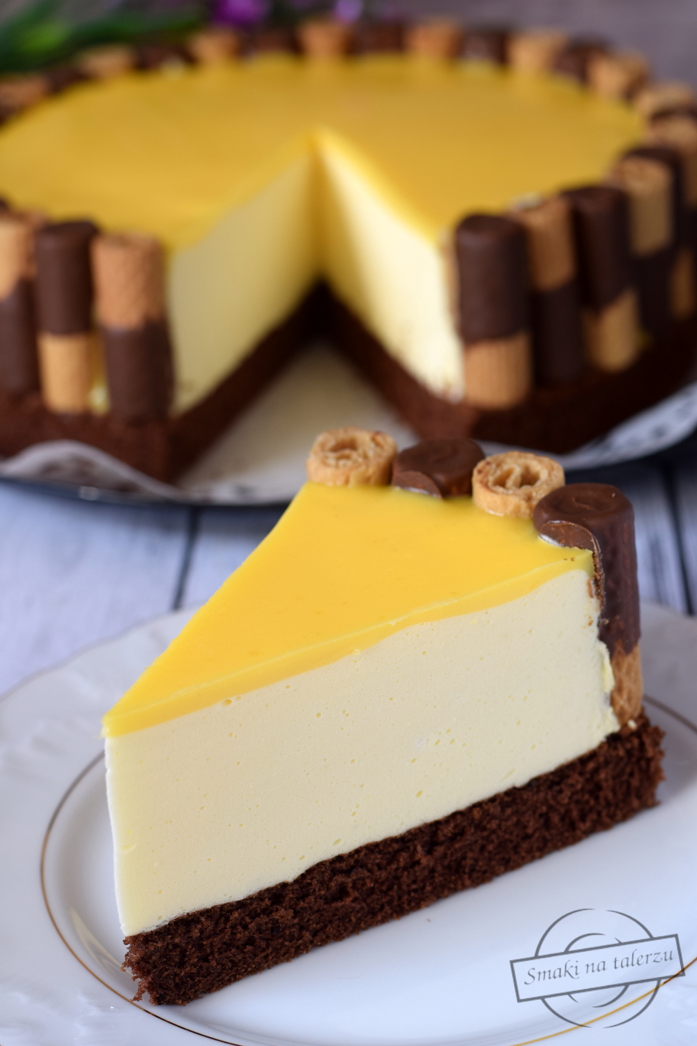 Na ciasto składa się kakaowy spód biszkoptowy, pianka adwokatowo-śmietanowa i adwokatowa żelka. Boki wyłożone są niedużymi rurkami do połowy oblanymi czekoladą, co nie ukrywam, było dla mnie dużym ułatwieniem przy krojeniu równych porcji;)