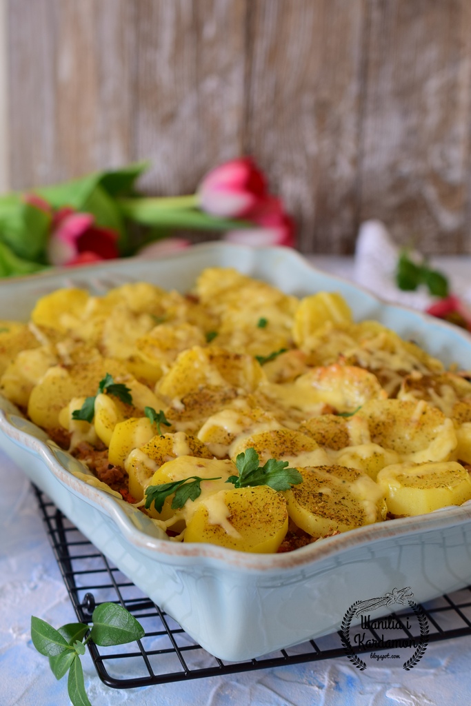 Sycące zapiekanki to coś co uwielbiamy wszyscy, łatwo je przygotować i stanowią solidny posiłek z piekarnika. Ta ziemniaczana z mięsem mielonym , startym serem i przyprawami na pewno będzie Waszą ulubioną. Tania, pyszna i pożywna.