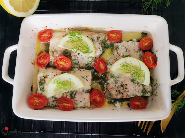 ŁOSOŚ PIECZONY NA MAŚLE Z POREM, KOPERKIEM I POMIDORKAMI KOKTAJLOWYMI