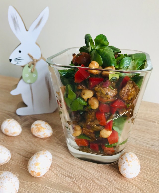 Ostatnio polecałam Wam sałatkę z ciecierzycą i kurczakiem a dziś polecam sałatkę z pieczonych bakłażanów również z ciecierzycą. Bardzo pożywna, sycąca, ale zarazem lekka i dość pikantna sałatka, która pięknie się prezentuję na imprezowym stole, a także z pewnością zaspokoi głód w pracy. Jeśli lubicie pieczone bakłażany, to koniecznie