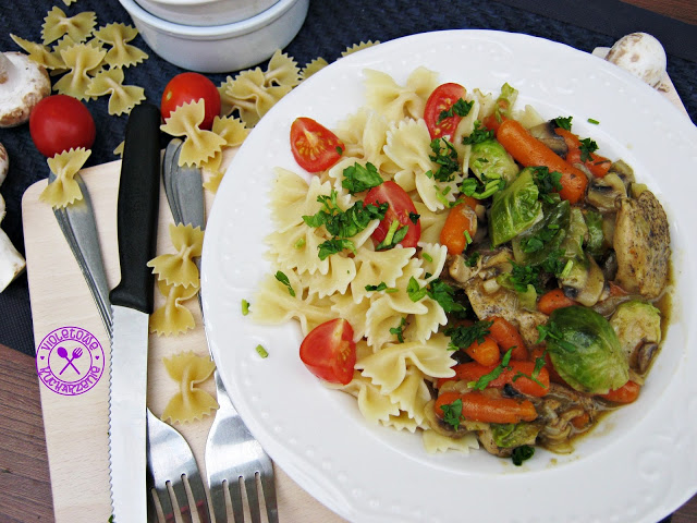 Szybki i rozgrzewający obiad z makaronem. Brukselka oraz mini marchewki nadają daniu…